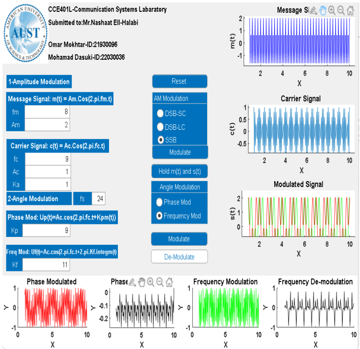 The "Amplitude Modulation and Frequency Modulation MATLAB App" is a user-friendly project that empowers users to explore and analyze modulation techniques for their input signals. Developed using MATLAB App Designer, the interactive application allows users to visualize and compare the effects of amplitude modulation (AM) and frequency modulation (FM) on their input signals in real-time. Through an intuitive graphical interface, users can adjust modulation parameters, such as modulation index and carrier frequency, to observe how these parameters influence the output signal. The project's versatility and ease-of-use make it a valuable tool for students, researchers, and enthusiasts seeking to deepen their understanding of modulation techniques and their applications in communication systems.