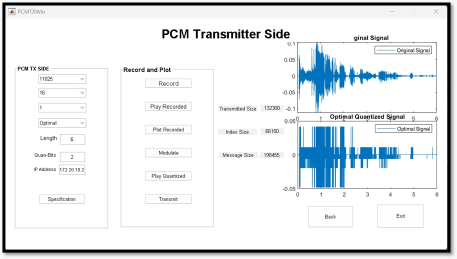 This project involves the design and implementation of a digital communication system using MATLAB software with the TCP/IP protocol, enabling users to transmit signals between devices by entering the respective IP addresses. The system leverages MATLAB's capabilities for signal processing and manipulation, establishing a secure and error-free connection between the transmitter and the receiver. Its flexibility allows customization for various signal types and modulation schemes, making it suitable for diverse applications like wireless sensor networks and IoT devices. The project serves as an educational tool, providing practical insights into digital communication principles and networking concepts within a MATLAB environment, and contributes to advancing digital communication technologies.