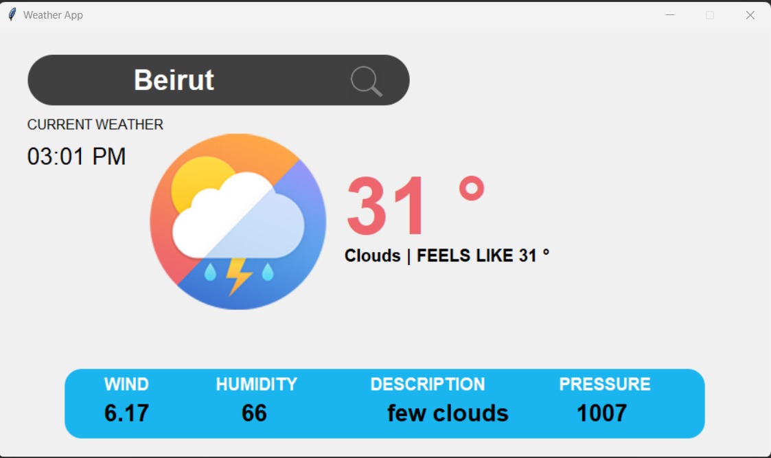 This project involves the creation of a user-friendly Graphical User Interface (GUI) using Python and a Weather API to allow users to enter a city name and retrieve real-time weather data, including humidity, temperature, pressure, and wind speed. The GUI streamlines the process of accessing weather information, displaying the data in an organized format. Python's versatility enables seamless integration with the Weather API, ensuring accurate and up-to-date data retrieval. The project emphasizes efficiency and error handling, providing users with reliable weather updates in an interactive and visually appealing interface. It serves as an educational resource for GUI development and API integration, showcasing the potential of programming for real-time data retrieval and enhancing the accessibility of weather information for users.